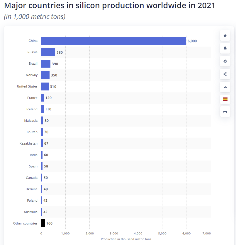 Most silica is produced by China. By a lot. The next-largest producer of silica? Russia. (Thank you Statista for the following chart).